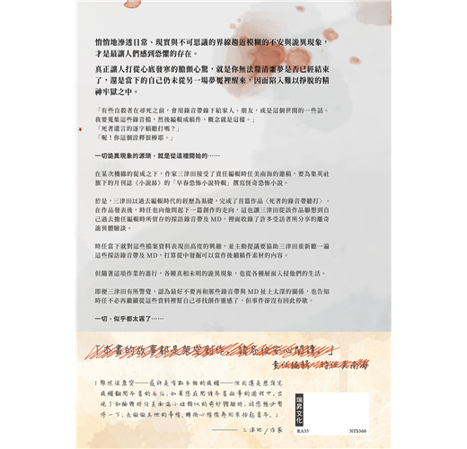 「雖然很唐突──或許是有點多餘的提醒──但我還是想預先提醒翻閱本書的各位,如果您在閱讀本書故事的過程中,出現了和編輯時任美南海小姐類似的奇妙體驗時,請您務必暫停一下,去做做其他的事情、轉換心情後再回來拾起書本。」