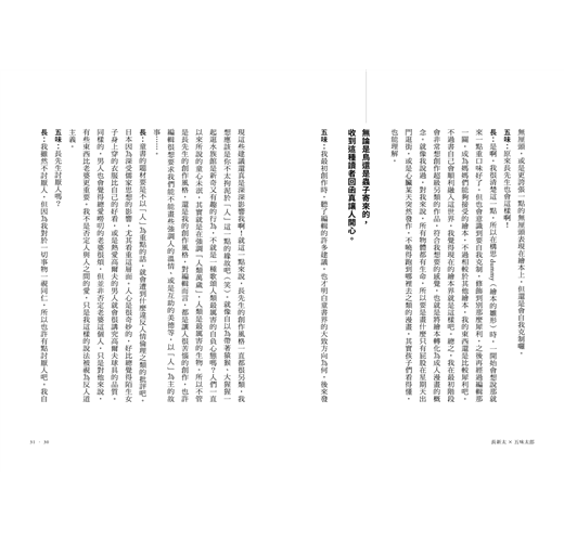 然後於一九九〇年將所有對談內容彙整成《坦率且任性》這本書(偕成社)。時隔二十八年後,二〇一八年日方又以《聊聊繪本吧對談集》(アノニマ・スタジオ)為名重新出版,中文版也於二〇二一年二月將這本夢幻企劃著作呈現給中文讀者。本書匯集了十八位日本重量級藝文界人士,在對談中直訴創作的初心、藝術信仰、家庭等,直至今日來看,依舊是很難超越的精采企畫。
