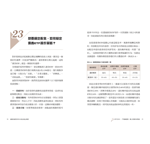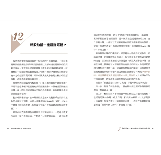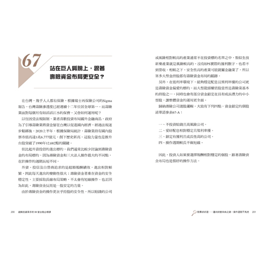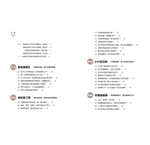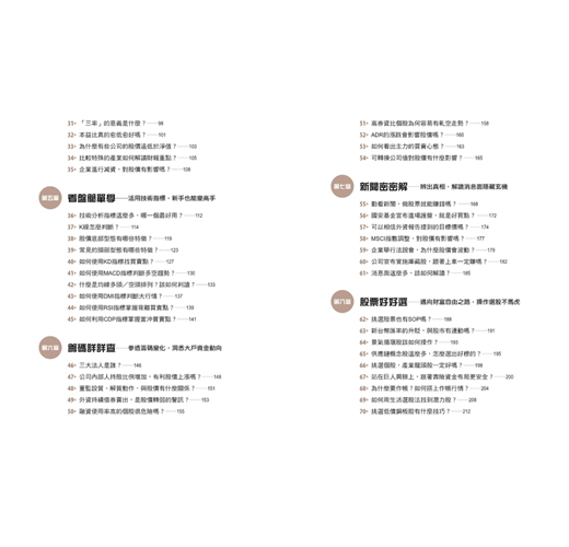 一本好的理財書最重要的就是接地氣,我喜歡這本書的QA模式, 88 個問與答精準切中投資人的盲點,例如外資目標價可信嗎?國安基金宣布進場就是好買點?看新聞做股票可以賺錢嗎?金融股的存股如何挑?諸如此類有關股市操作常見的疑難雜症幾乎全解惑,適合股市新手練就基本功、資深股民隨時翻閱,更有助於打通任督二脈!