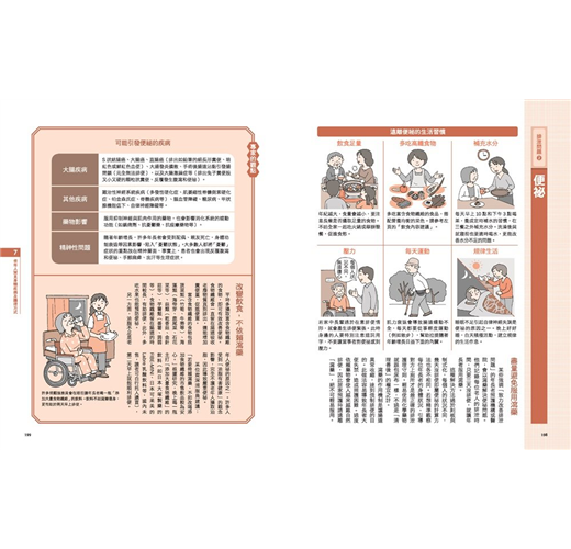 ►【老人常見疾病解析】列出19個常見的臨床症狀,給予最正確的疾病護理。‧尿失禁不一定要包尿布,應觀察年長者的失禁情況,幫助其恢復正常排泄功能。