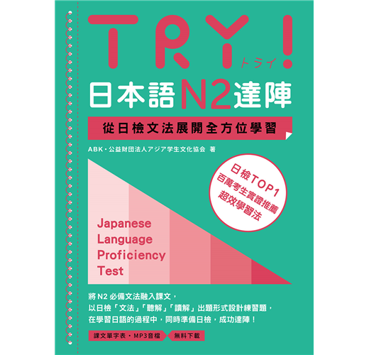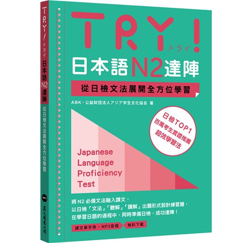 「TRY!日本語能力試験 文法から伸ばす日本語」系列為ABK(公益財団法人アジア学生文化協会)以其35年的日語教育經驗編纂而成。編寫期間,也同時作為旗下日本語學校的授課教材,因而經過實際教學的反覆驗證,是目前將日檢文法整理得最完備的實用教材,讓讀者在學習日語的過程中能同時熟悉日檢題型,事半功倍,深獲第一線教師們高度肯定!