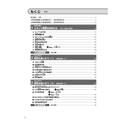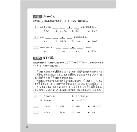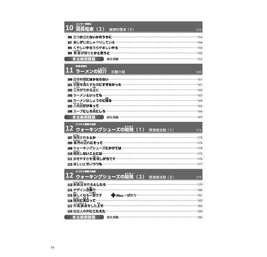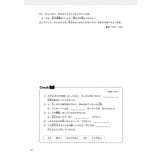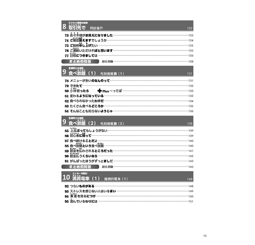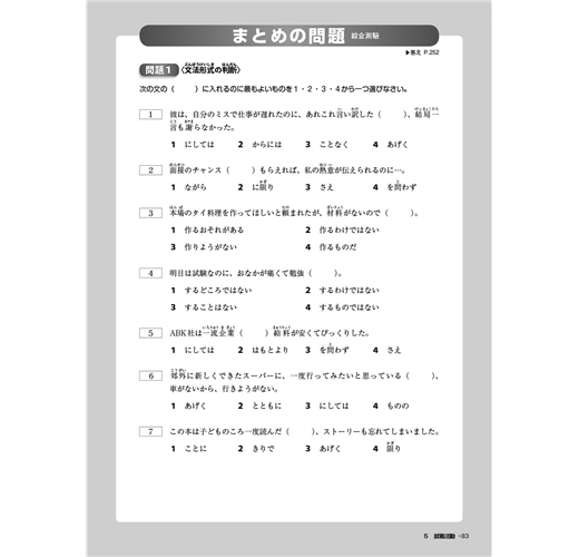 為求最佳的學習成果,書中設計大量練習題目,幫助學習者找出不足之處。每個章節「Check單元」,提供簡單的練習題目,務必釐清該章的文法觀念。在每章結束後還有綜合測驗(もとめの問題),特別的是,作者採用日檢三科的出題形式,學習者在複習時,「文法」、「聽解」、「讀解」的作答能力也可同步提升。