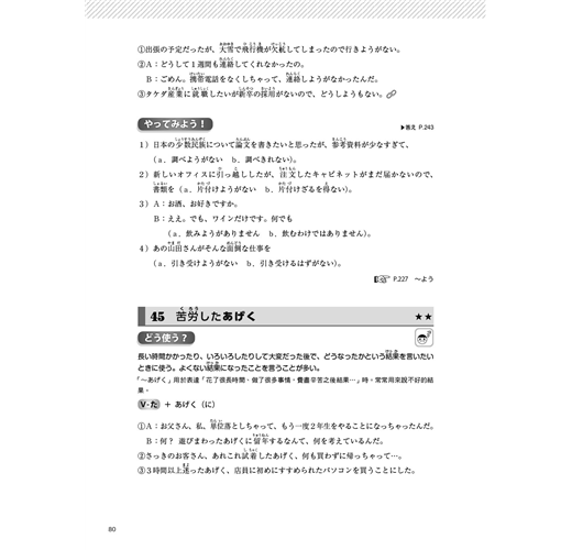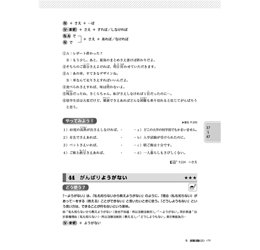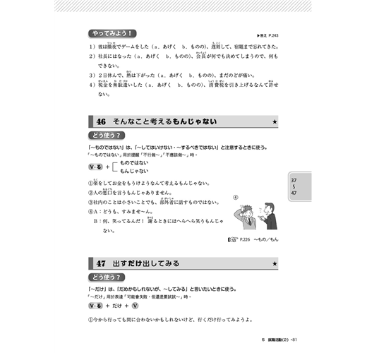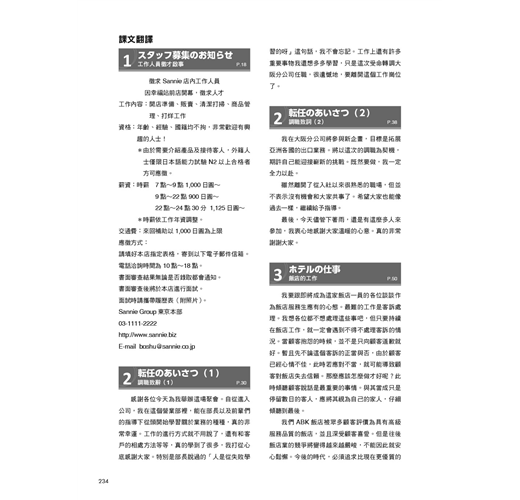 當日文程度越好時,對於相似句型的文法細節往往更容易混淆。每個文法解說皆再提供數個相關例句輔助說明,學習者可更加熟悉文法內容。若例句延伸出其他文法觀念或易混淆句型,書裡也會標示相關參考的頁碼,讀者可立即查詢,相互參照,加深記憶。