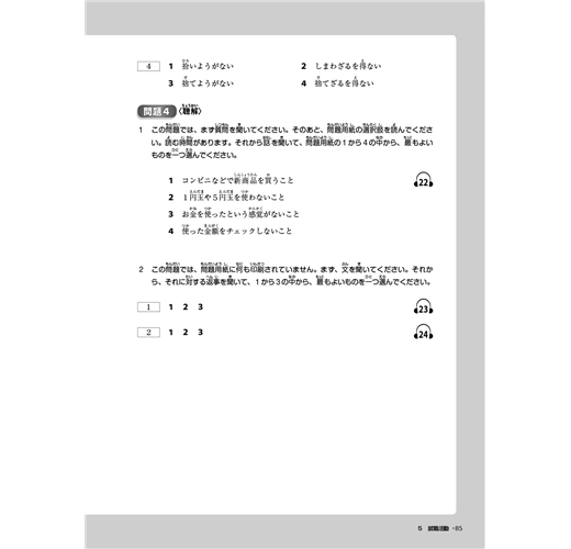 「 綜合測驗」採與日本語能力試驗相同的題型出題,如此有助於各位的應考準備,等於以這一本書即可同時練習日本語能力試驗中的「文法」「讀解」「聽解」三項目。
