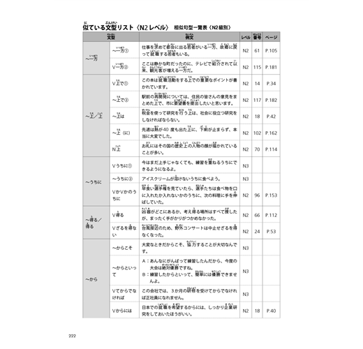 號稱文法界祕笈的「相似句型一覽表」,除了把 N2級別以下相似的文法句型整理出來,還有級數、句型編號和對應的課本頁數!方便學習者查詢對照,融會貫通。