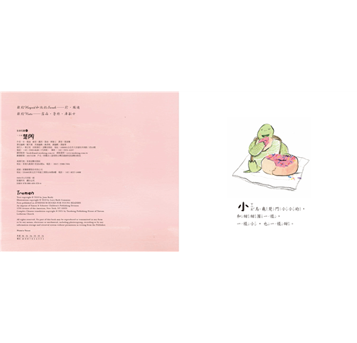 這是小烏龜和小主人的故事,不過,因為故事是從小烏龜的觀點述說,所以文字寫的是小烏龜楚門和「他的莎拉」,而不是小烏龜和他的主人莎拉。從這一句話開始就提醒我們,讀這個故事時得用特別的角度。而這隻安靜、喜歡想事情的小烏龜楚門,可是給了我們不少提醒呢!
