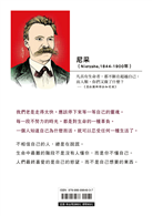 訂購本商品前請務必詳閱退換貨原則。尼采(Friedrich Wilhelm Nietzsche,1844.10.15~1900.8.25),著名德國語言學家、哲學家、文化評論家、詩人、作曲家,對於後代哲學的發展影響極大。