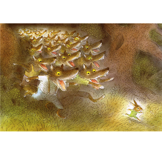 書中誇張、幽默的繪畫風格,格外使人眼睛一亮;活カ十足的線條,讓畫面顯得更具生命力。繪者特別在主畫面之外單獨設計跨頁,隨著故事的進行,野狼一次又一次出現逗趣滑稽的攻擊動作,不但逗得孩子樂不可支,且啼且笑,還可藉此延伸孩子的想像空間,讓想像力大大的瘋狂一番呢!當然啦!大人在一遍又一遍閱讀的同時,不免偷偷回憶起兒時的夢境,發出會心的微笑!