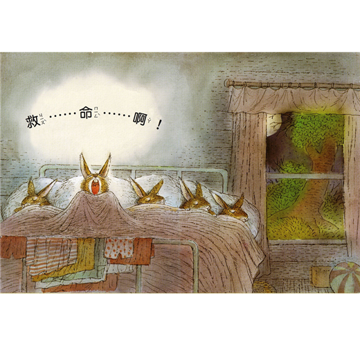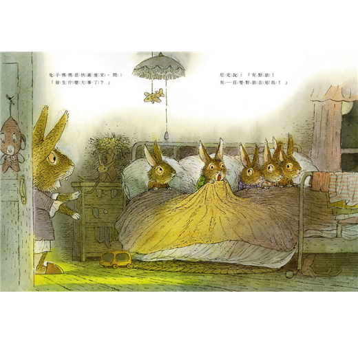兔寶寶尼克半夜大喊救命,他驚嚇的說:「窗外有100隻野狼要抓他!」兔媽媽告訴他那只是個惡夢...,但是過了不久,同床的四個兔寶寶居然一起大喊救命,於是媽媽靈機一動,拿了掃把衝到屋外,乒乒乓乓的把大野狼嚇跑..。這是個適合於睡前親子共讀的故事,祝福每個孩子都有個甜美的夢。