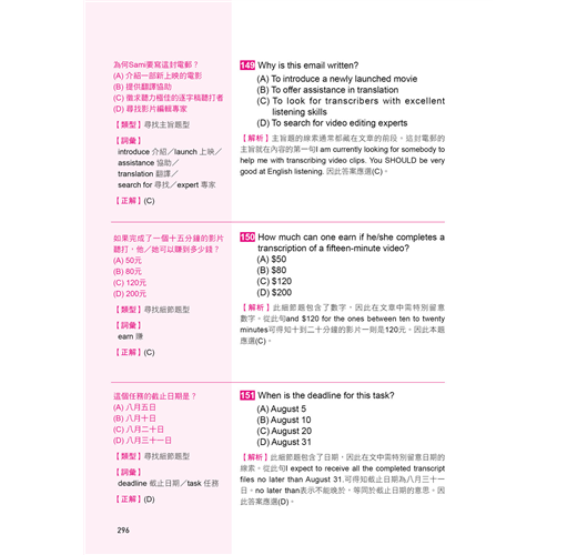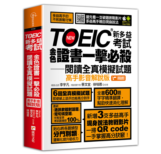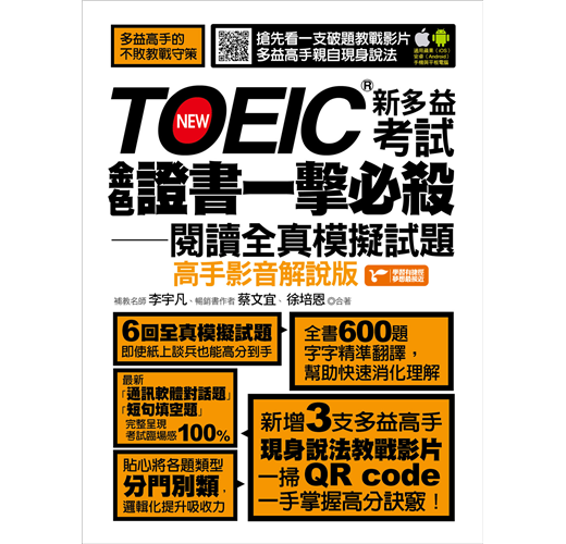 在全新打造的高手影音解說版中,擁有多益金色證書的多益高手將會現身說法分享自身經驗,從立定讀書計畫、讀書技巧分享、到新舊制多益閱讀題型比較分析,以及針對考試當天各大題的時間分配、解題方法和考試技巧進行地毯式的詳細分析。