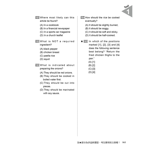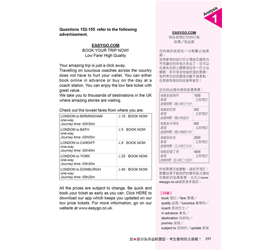 除翻譯以外,當然也有詳解說明,無論是單字、句型、文法、會話還是新增的圖表題目等等,都能藉由高手詳解,以最短速度找到破題的重點,並從中找到自己的弱點與缺失,進行改進,之後才能勇赴考場、毫不怯場!