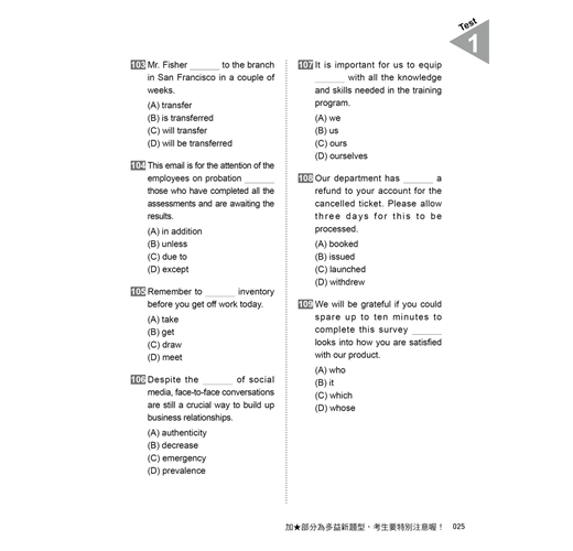 臨場感滿分的全真聽力試題,打造超擬真考場環境,徹底模擬改制後新多益考試的題型、題數、難易度、應用範圍等特色,無論是「即時通訊軟體對話」還是「句子填空題」都囊括在內,就是要你先好好適應,待到考試時才能發揮100%的應考實力!