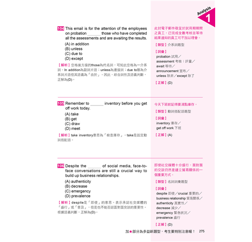 即便在同一大題中的題目,還是各有其不同的特色與對應的解題技巧,透過將每個題目分類的過程,就能讓人腦更有邏輯地去記憶、學習,並且有助於提升分析力。本書在解析中皆細心將所有題目做分類,讓你吸收得更快、更好!