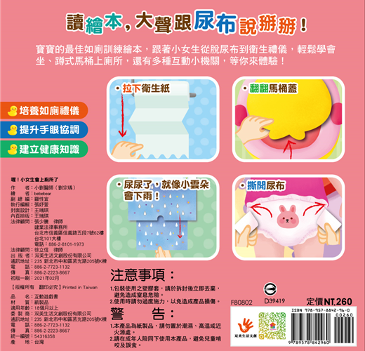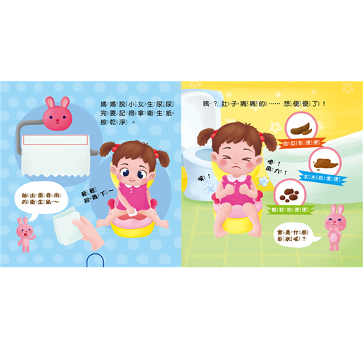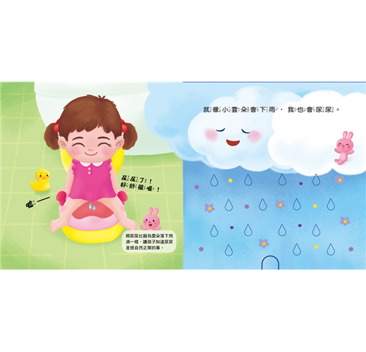 充滿想像力的故事情節,搭配明亮可愛的畫風,打破孩子對馬桶冰冷且未知的恐懼,建立滿滿的安全感與穩定情緒!而藉由觀察書中主角上廁所的有趣過程,加上多種驚喜小機關,不僅讓閱讀變得更有趣,也能激發孩子主動觀察尿意與便意、學習如廁技巧、健康知識、衛生禮儀等動機。您的寶貝還戒不掉尿布或正準備學上廁所嗎?現在就來聽聽專家怎麼說!