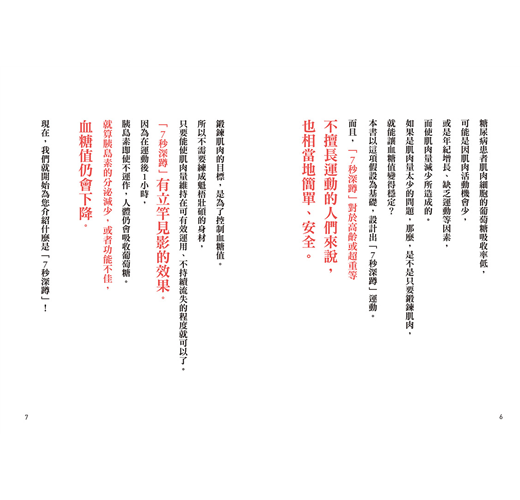 運動後1小時之內,即使胰島素分泌減少或功能不佳,肌肉仍可直接吸收葡萄糖,所以只要鍛鍊佔人體七成肌肉量的下半身(腿部及臀部),血糖值就能快速下降。而屬於伸展運動的「7秒深蹲」又能更大量地消耗原本儲存在肌肉裡的肝醣,加速血糖被肌肉吸收,在此雙重作用下,因此能達到立竿見影之效。