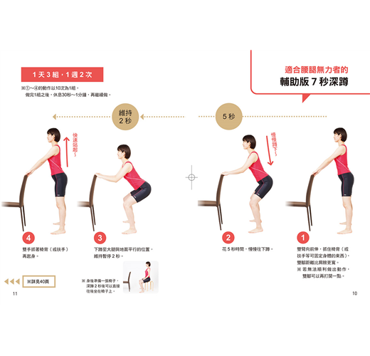 針對年紀大或過重的糖尿病患者,因為缺乏運動的關係,腰部、膝蓋通常會退化無力,因此作者也提供有椅子輔助的深蹲版本。雙手扶著前方椅背提供支撐力,身後也可以再加一張椅子,供站起時暫坐休息,對於體力差或高齡者來說也相對簡單、安全。