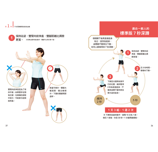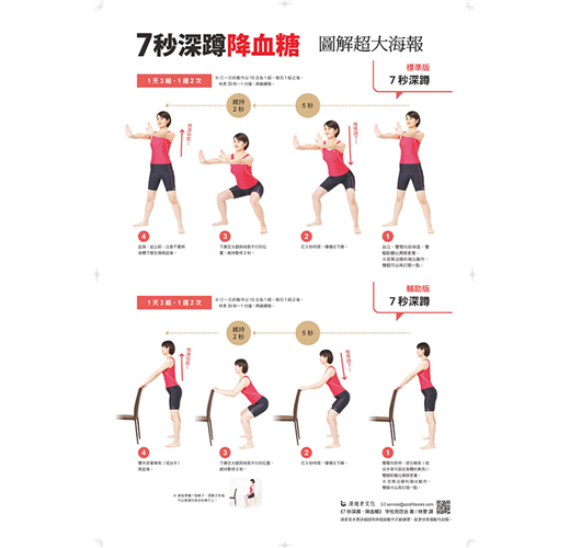「7秒深蹲」是長年研究治療糖尿病的內科醫生所研發,對降血糖特別有成效的簡易肌力運動。跟一般深蹲相比,7秒深蹲步幅較大,深蹲持續時間較長,而且手臂往前伸直或扶著椅背,作者也建議出聲數秒,有助於在運動中維持呼吸,避免憋氣。