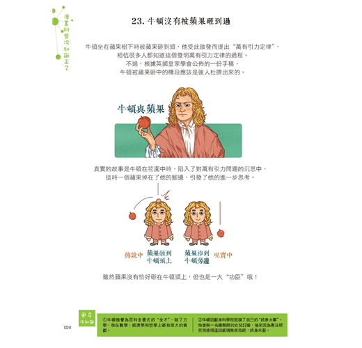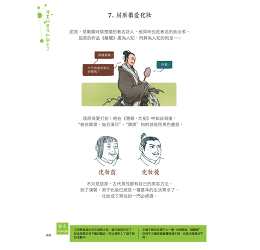 ◎牛頓有看到掉下來的蘋果,但沒被砸到頭、貝多芬也愛喝咖啡,但有一個原則、愛迪生是自學團的,所以只上過三個月的小學、達爾文其實是個吃貨、林肯不只是總統還是摔角冠軍、服部半藏是日本史上最強的忍者家族、武田信玄則是日本第一個精通《孫子兵法》的名將、孔子力氣超大又精通武藝、屈原原來愛化妝、曹操根本不姓曹、張飛可是個美男子、李白又吃霸王餐、白居易為什麼一年只洗一次頭、乾隆皇帝根本是個寫詩狂人……
