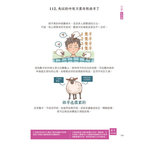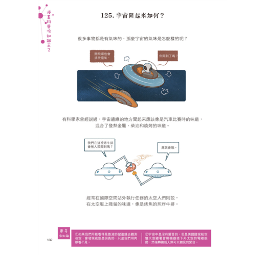 ◎辣味不是味覺而是痛覺、火苗向上卻是因為受重力影響、石英鐘停下來時,秒針總是停在9、失眠的時候千萬不要再數綿羊、夢遊的人也算是在做夢嗎、起雞皮疙瘩不是只有一種原因、鑽石可不是世界上最硬的物質、樹葉為什麼會變顏色、地球平均每天變重60噸、宇宙也有味道……