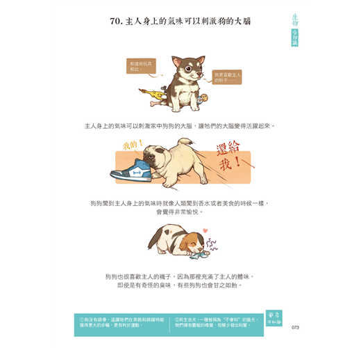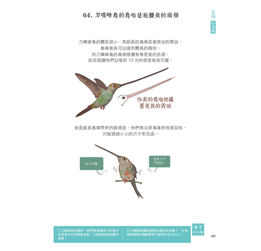 ◎在恐龍出現之前,奇蝦早稱霸了地球、蛇頸龍長長的脖子不如你想像中的靈活、最早的烏龜根本沒有強大的硬派龜殼、六角恐龍不但可以再生四肢,還能再生大腦和心臟、有位叫海參的但卻不會游泳、變色龍變色的目的才不是只為了偽裝、蝴蝶的鼻子其實長在觸角上、食蟻獸很長舌、北極熊的皮膚是黑色的、馬常站著睡覺的……