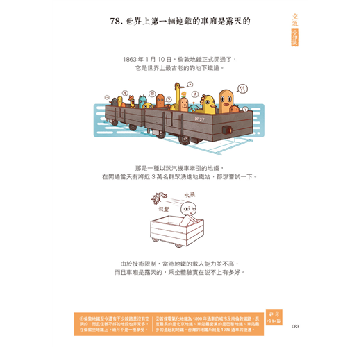 ◎人類最早發明的水上交通工具原來是獨木舟、為什麼大輪船的螺旋槳反而那麼小、世界上第一輛地鐵的車廂是露天的啦、剎車和油門為什麼要一高一低、熱氣球的第一批乘客竟然是幾隻小動物、史上第一架飛機原來只飛了12秒、為什麼噴射機飛過天空會留下一道白煙、你知道買一件太空衣要多少錢嗎……