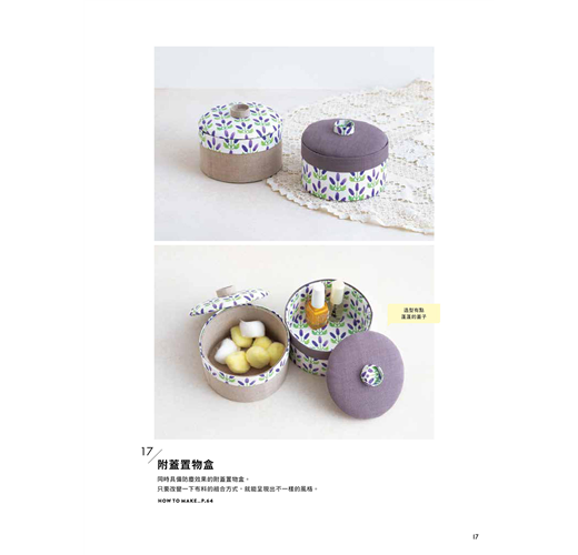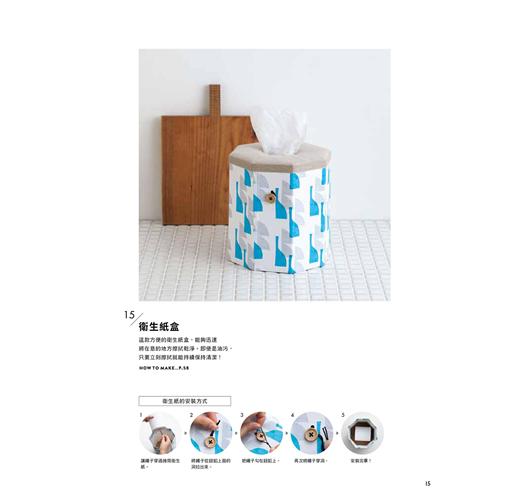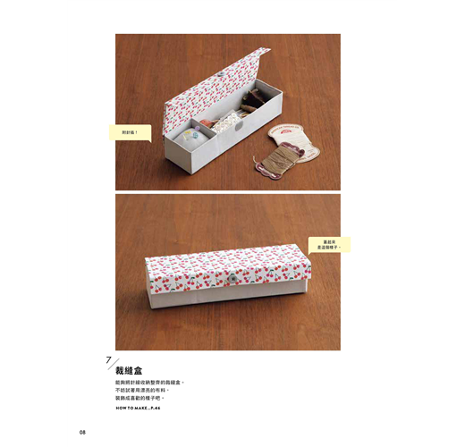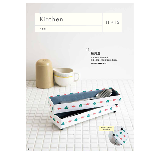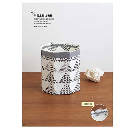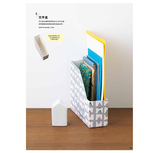 準備好剪刀、膠帶,親自挑選幾款中意的布料,喜歡可愛的又或者是具設計感的北歐風,以實用性最高的生活雜貨為主,環保再利用,運用容易取得的材料:牛奶盒、瓦楞紙板等生活素材,即可製作出便利又耐用的布盒等收納工具。
