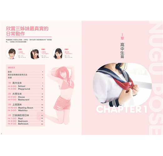 共收錄796張平常看不見的日常暴露脫衣姿勢。由白井柚香、夏目愛莉、一之瀨戀等人共同演繹,收錄站、坐、躺三種姿勢,並有不同角度與高度的照片,包括正面、背面、俯視、仰角等,搭配符合各場景的背景,包括室內外等豐富的景色,可供作畫時參考。是繪圖時不可或缺的工具書!