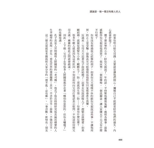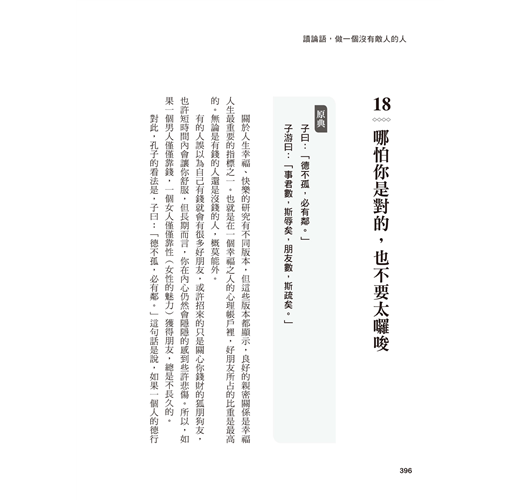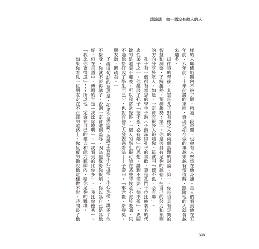 大學以後,如何在複雜的人際關係中自我定位,深深困擾著我。攻讀中文所碩士的期間,我們坐在教室裡,用各種深奧的學術名詞討論著孔子……分神的我翻著《論語》一條條原文,某幾句突然打中了我──他說的正是我當時的人際困惑,他說的正是一種人可以選擇的更好行為標準。