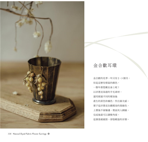 從植物身上萃取的顏色,再自己詮釋作出植物的姿態,佩戴在身上,是一件很浪漫的事。在接近大自然的地方,緩慢地經營著品牌,用對環境友善的方式創作。手作出的一顆顆的果實,就像是植物孕育果實一樣的美好自然。
