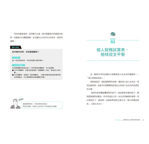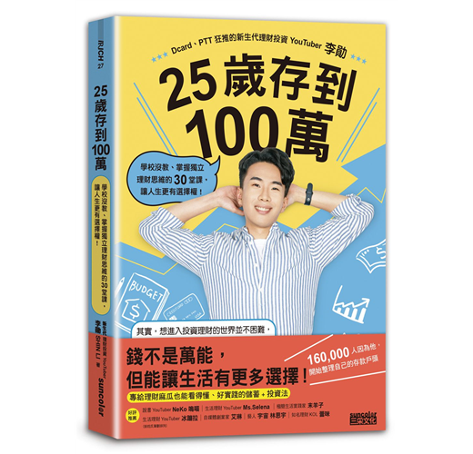 我也是個學生時期就會自然而然把零用錢存起來的人,不用存多,有剩就存,因為我知道它會積少成多,之後還要拿它們來做更長遠的計畫。雖然也沒有實際訂出什麼目標,但至少我知道長大後會需要更多的錢,所以我開始學會控制慾望,非到必要不一定要買新的,東西不一定要用貴的,開啟了我價值觀的轉變,我也對這件事樂在其中,因為看著戶頭錢愈來愈多而感到開心有成就感,要開始對數字敏感且有興趣,這樣做這件事才會有意義。就像作者把他的經歷直接與大家分享出來一樣,毫無藏私,希望大家試著去思考自己適用什麼方式,不要讓自己錯過理財的機會,並且以清楚的圖文解說,讓大家更快有效理財,明天就開始著手,謝謝李勛的分享,我將本書推薦給大家。