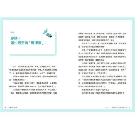 我一直很想強調的一點是:「我不是專家,也不想當專家,我想當的只是你的朋友」。所以在看這本書的時候,我希望你可以抱持著輕鬆愉悅的心情。我覺得存錢、理財不該是壓力,一旦你把它認定為負擔,那你一定會因為太痛苦而放棄。所以希望你可以透過我的故事,以及我希望傳達出的理念背後的溫度,來照亮你許久不見天日的內心。