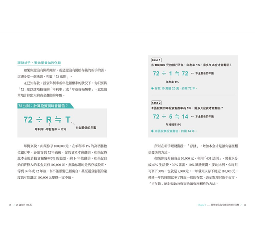所以在新手理財階段,「存錢」,增加本金才是讓你資產翻倍最快的方式。如果你每月薪資是30,000 元,利用「631 法則」,將薪水分成60% 生活費,30% 儲蓄,10% 風險規劃。按此比例,你每月可存下30%,也就是9,000 元,一年就可以存下將近110,000 元,僅僅一年的時間就多了將近一倍的存款。表示對理財新手而言,「多存錢」絕對是比投資更快讓資產翻倍的方法。等你的積蓄達到一定的數字之後,就可提撥部分的錢進行投資,這樣就可以讓錢滾錢,並且讓自己未來可以有更多、更好的選擇。