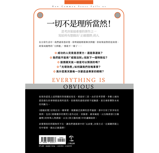 在日常生活中,直覺可以幫助我們解決99%的問題,但如果面對的是商業、政策或趨勢類的「大問題」,這種小小的認知偏誤,卻會讓個人判斷錯誤、公司錯失良機,整個社會也會因此錯置資源。本書將告訴你,常理與直覺如何誤導我們,讓我們自以為知道的比實際還多。