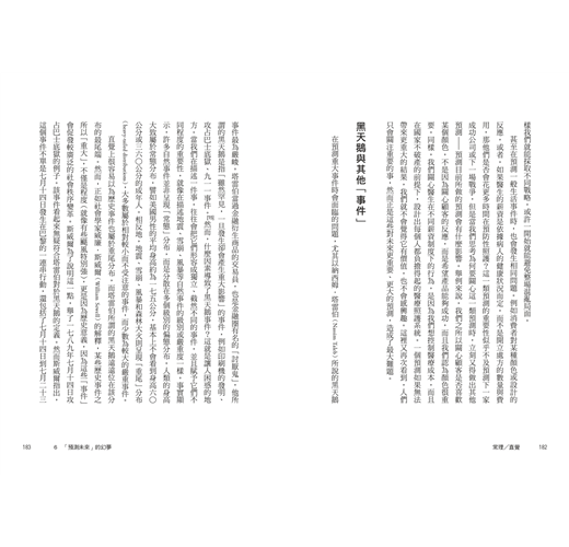預測一個具體的結果,跟預測一個結果出現的機率完全不同。我們意識到這一點之後,對於可預測的事件類型應該會改觀。但我們習慣「從過去吸取教訓」的學習方式,也產生另一個更違反直覺的問題,那就是,我們從開始就不知道自己該預測什麼。坦白說,就像過去「已發生過無數事件」一樣,我們隨時都能做出無數預測。同時,就像我們其實不關心大部分的過去事件,我們也不在意全部的潛在預測。反之我們在意的只有極少數預測──如果我們能事先這樣預測,可能確實會產生重大改變。美國航空官員如果當初預料到恐怖分子將帶著美工刀劫持飛機,企圖撞向世貿中心和五角大廈,就可以採取預防措施,像是強化駕駛艙門、加強機場安檢,進而避免這類意外。還有,如果在一九九○年代末,有個投資者知道有一家小型新創公司叫Google,將來會發展成網際網路龍頭,他就可以透過投資大賺一筆。