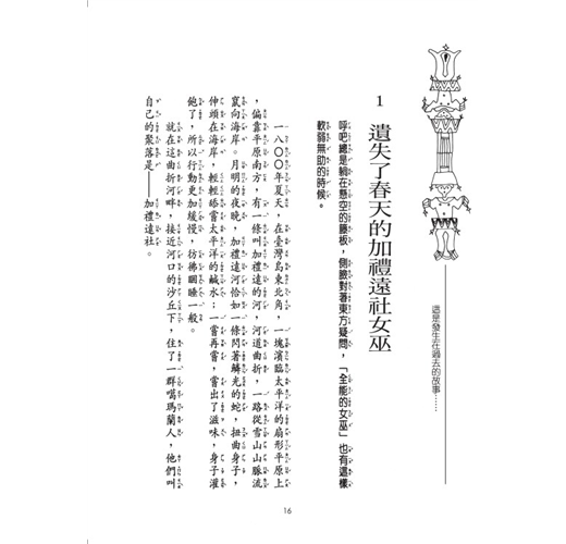 他們向來認為,加禮遠社的女子,是這河域十三個聚落中最懂得打扮,也最善於整理家務的美麗女人;加禮遠社的男子最勤勞,酒量也最好;加禮遠社的孩子,承傳這樣的血統和好教養,當然也是最健康、最活潑的;加禮遠社的七個女巫師,是社裡最常出外走動和外界聯繫的人,她們很謙虛,很明瞭禮節。但是,經過多年的比較,大家也禁不住認為,放眼這整個平原的三十六社,還是加禮遠社的女巫「對祖先的歷史記得最清楚」、「驅邪逐魔的法術最高明」、「治癒疾病的成功率最高」,而且,驅邪舞蹈的腳步最正確,舞姿也最曼妙。