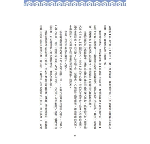 他們向來認為,加禮遠社的女子,是這河域十三個聚落中最懂得打扮,也最善於整理家務的美麗女人;加禮遠社...