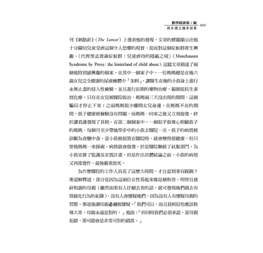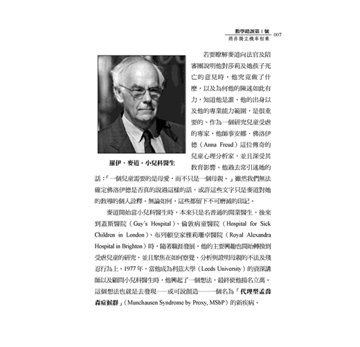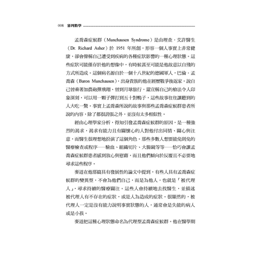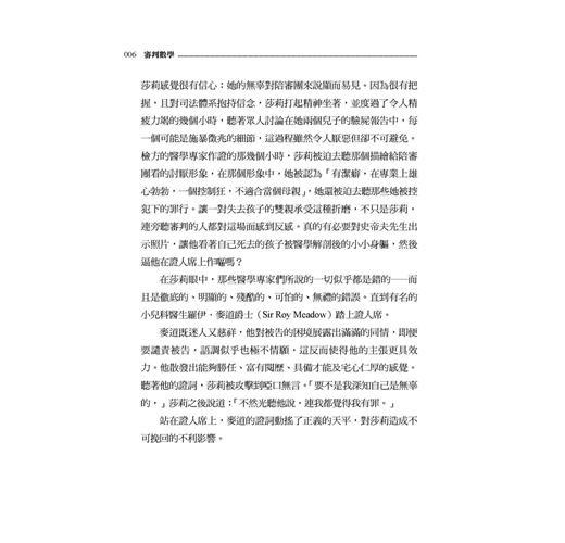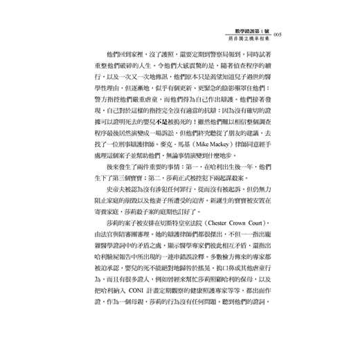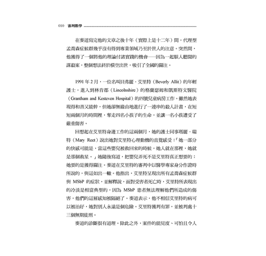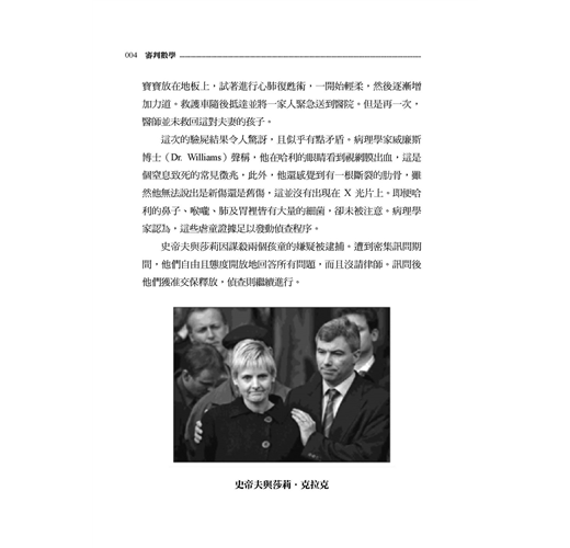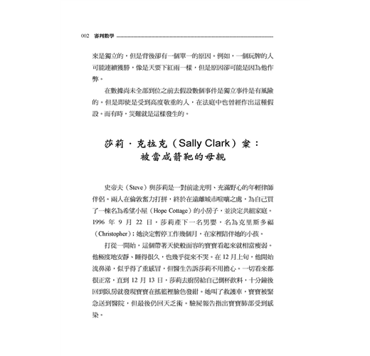 本書揉合法庭、歷史、數學等豐富素材,生動地呈現數學如何遭到濫用與誤用,同時也告訴我們:要證明一個人的清白,法律專業並不總是足夠。