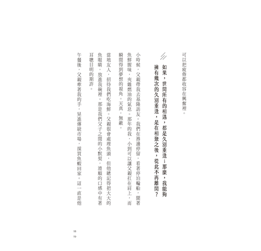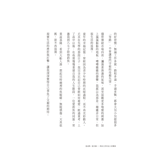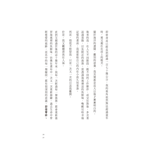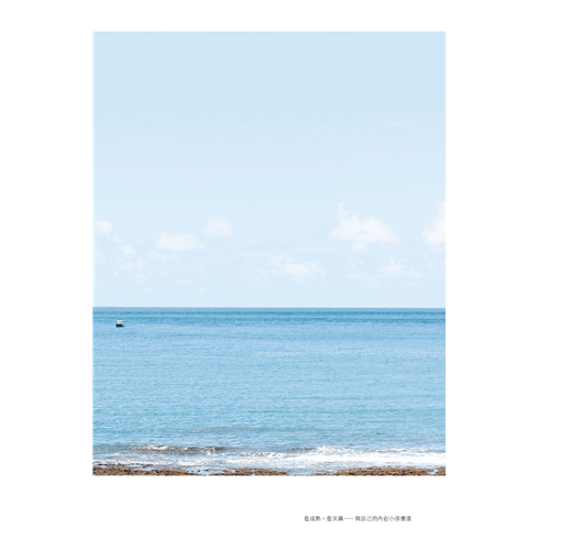 迷惘的時候,我常獨自走向大海。懷想幼年時,父親把我扛在肩上逐浪,天真的笑聲,延伸視野的寬廣;回味初戀夜遊港邊的漁船,在海面舖滿星光。其實,我真正期盼的,是與自己的內在小孩重逢。