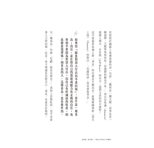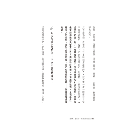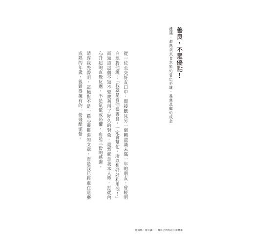 雖然我不知道,什麼時候「天真」竟也變成帶貶抑的詞彙,和世俗的「白目」有些灰色地帶的重疊;但我知道,成熟的天真,十分珍貴。它讓我在心生委屈與憤怒之後,因為原諒對方而學會去愛;讓我在遭遇挫折與傷害之後,因為懂得疼惜自己而決定放下。