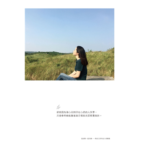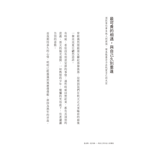 隨著生命愈來愈成熟,閱歷愈來愈豐富,長大後的我們,有足夠的能力去辨識,是或非、對或錯、愛或恨、黑或白、山或海、漁火或星光......但我很慶幸自己,臣服於無以數計的世事無常後,繞了生命的遠路,越過青春的迢遠,能夠與內在小孩再度重逢。