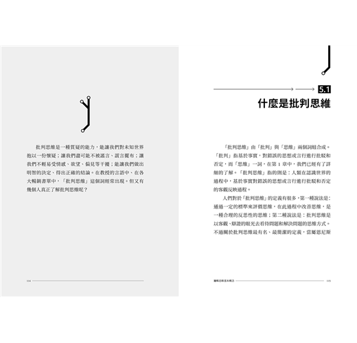 書中詳細介紹了一些常見思維的基本概念,進而擴展出思維在生活中如何運用,同時,加入了作者的個人心得體會。