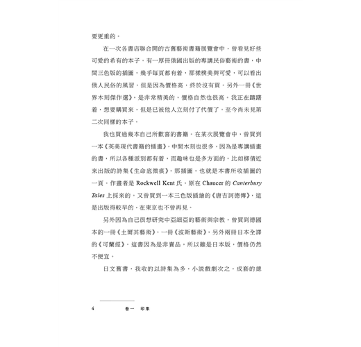 前兩章「印象」與「談藝」是常任俠先生多年來發表在國內報刊上的小品文精選。前者「印象」,是記錄其兩年留日經歷的隨筆,內容涉獵廣泛,包含了東京的書店、舞場、電影業、文藝界的見聞與思考。保守倒退的社會風氣、枉死戰場的平民青年、創作自由被剝奪的文藝工作者,都讓作者痛感日本軍閥對人民的剝削和壓迫。後者「談藝」,從中日文化藝術交流的角度,詳細談論了日本佛教藝術、繪畫、書法篆刻、雅樂、歌舞伎、茶道的歷史源流與發展歷程。