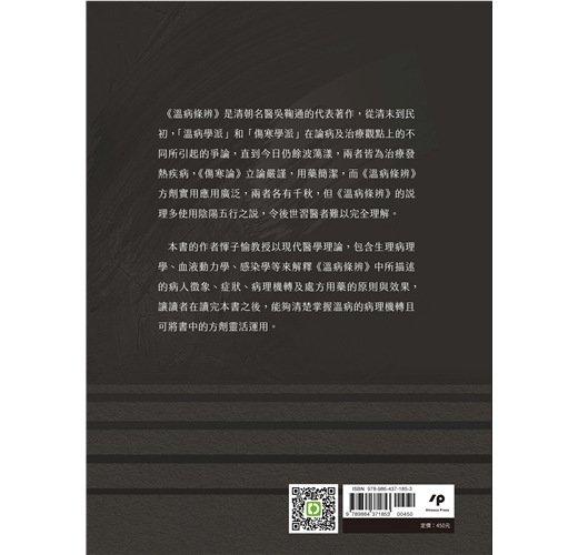 《溫病條辨》是清朝名醫吳鞠通的代表著作,從清末到民初,「溫病學派」和「傷寒學派」在論病及治療觀點上的不同所引起的爭論,直到今日仍餘波蕩漾,兩者皆為治療發熱疾病,傷寒論立論嚴謹,用藥簡潔,而溫病條辨方劑實用應用廣泛,兩者各有千秋,但溫病條辨的說理多使用陰陽五行之說,令後世習醫者難以完全理解。本書的作者惲子愉教授以現代醫學理論,包含生理病理學、血液動力學、感染學等來解釋溫病條辨中所描述的病人徵象、症狀、病理機轉及處方用藥的原則與效果,讓讀者在讀完本書之後,能夠清楚掌握溫病的病理機轉且可將書中的方劑靈活運用。