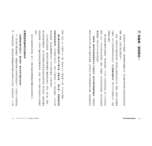 在第三章第十節介紹過,為了改善胰島素抗性,並不需要進行為期好幾天的斷食,只要藉由間歇性斷食,也就是一天之中只要有十六個小時不要吃東西,就能帶來很好的效果。