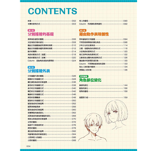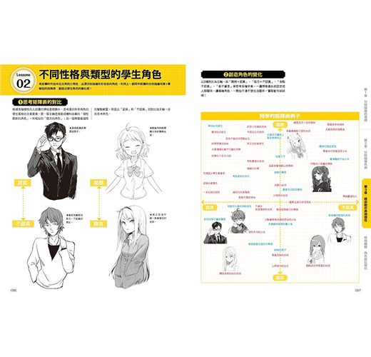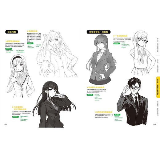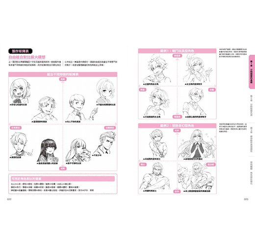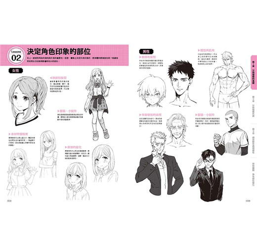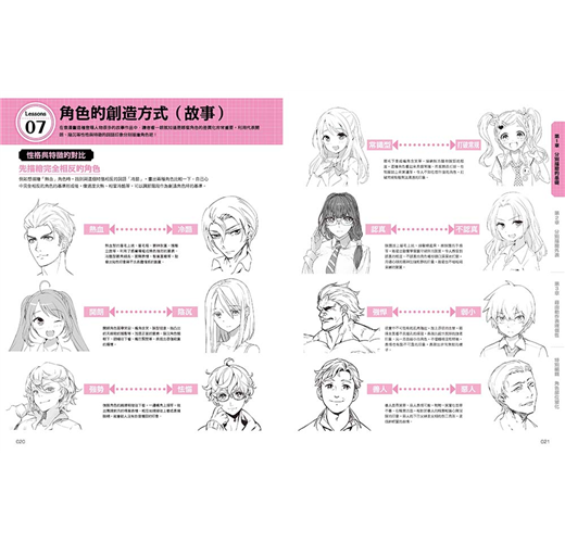 想要區分兩個角色不同的第一步是設計不同外形,如果你時常在搭車時或路上觀察來來往往的行人,那麼你一定也會發現什麼樣性格的人會選擇什麼樣的裝扮來展現自己,以貌取人固然不對,但基本性格架構仍有其根據在,如果你還不清楚如何掌握用圖像建構人物性格、如何設計角色,不妨參考本書,透過找出臉部和身體特徵,讓人設更豐滿,在繪製的過程中,也可以一步步摸索出故事背景。