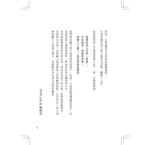 我們再也聽不到小池老師的話語了。但是,小池老師想傳遞的訊息、以及深愛的著作,將永存於各位讀者的心中。