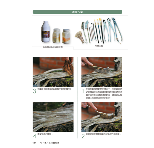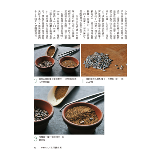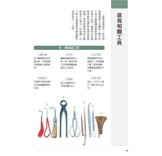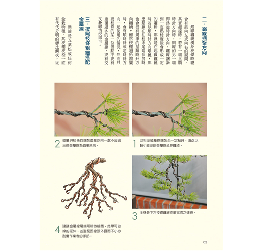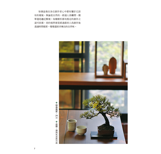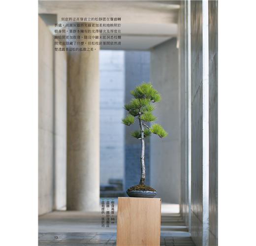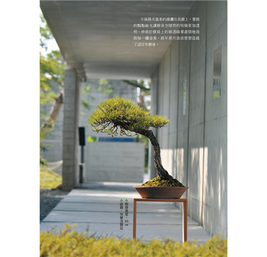 ■以台灣五葉松為主角,從素材挑選技巧、日照、澆水量、泥土介質選擇、施肥,至相關輔助工具介紹,皆有詳細說明及要點提示。