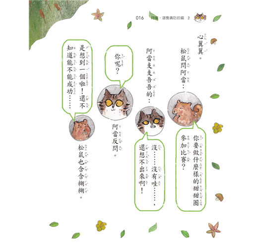 本書收錄了阿當的四則幸福故事。這一次,阿當發揮對「吃」的研究精神,開發出神奇的游泳圈甜甜圈,還讓貓巫婆不再逼大家吃奇怪布丁,拯救了不少小動物!到底有多厲害又多神奇?一起進入阿當的世界裡,感受大口吃甜點、大聲喵喵喵的幸福吧!