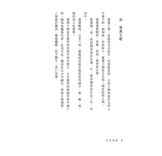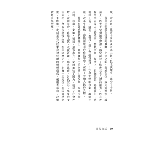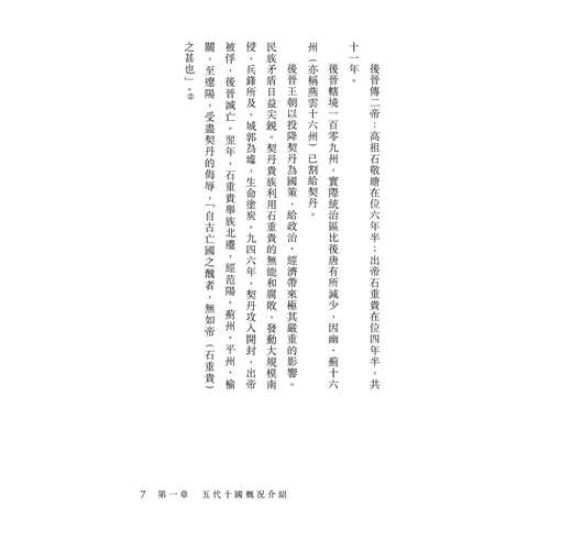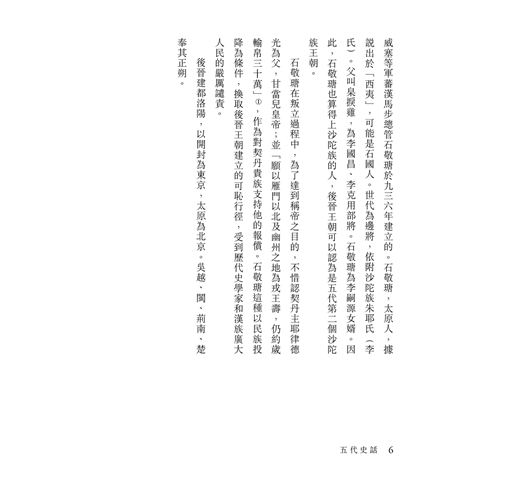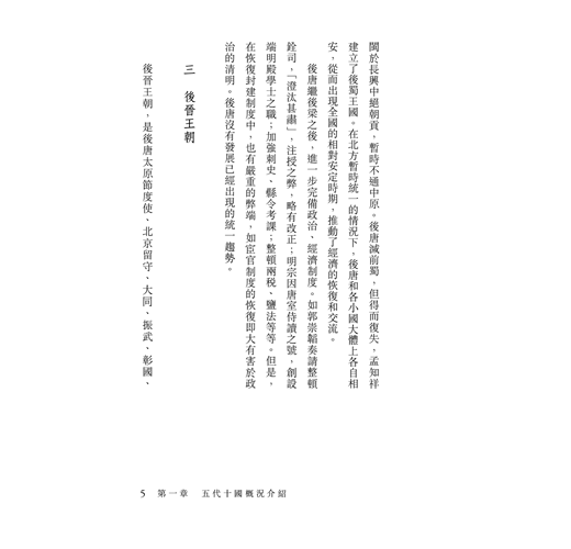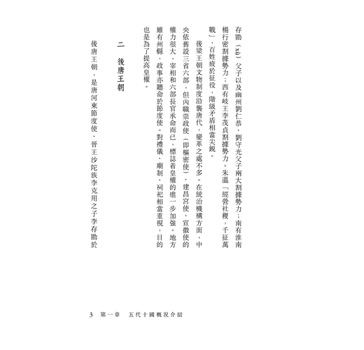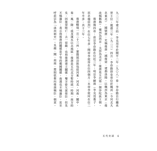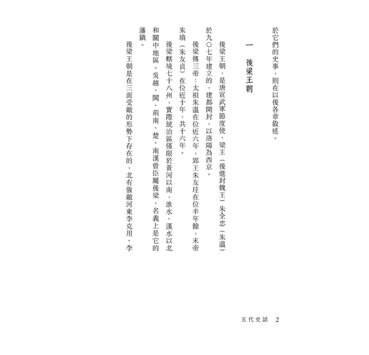 五代十國(907—960),是唐朝以後出現的一個分裂時代,是唐末藩鎮割據的繼續與發展。北方的後梁、後唐、後晉、後漢、後周五個王朝,史稱五代;南方的吳與南唐、吳越、閩、荊南、楚、南漢、前蜀與後蜀以及河東的北漢十個割據政權,史稱十國。五代十國這段歷史,頭緒紛亂,錯綜複雜。為了使讀者在閱讀本書時,先對更迭頻繁的小朝廷、犬牙交錯的割據政權,有一個簡要的認識,本章先將以上各個王朝、小國的建立經過、地理環境、政治簡況等,作一扼要的介紹,至於它們的史事,則在以後各章敘述。