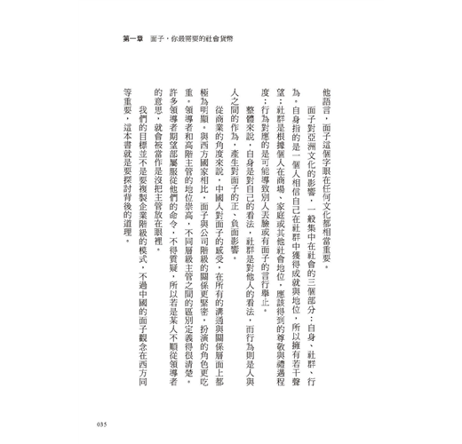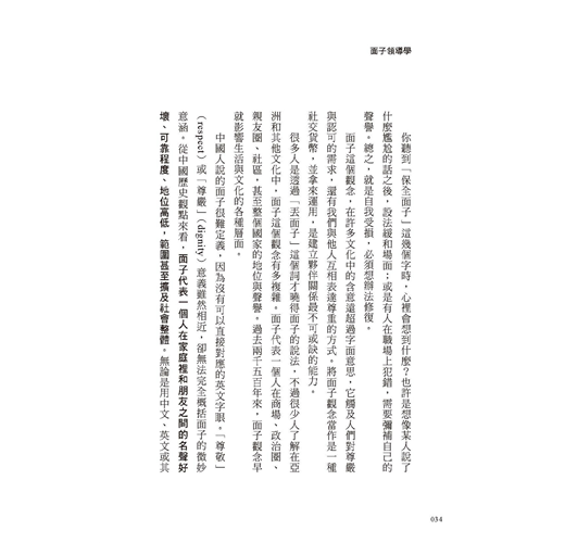 出版這本書,時機正好。「保全面子」的說法源自中國,但是這個觀念放諸四海皆準,它使人與人之間能交流、打破藩籬,建立信任感與長期關係。保全面子的想法滲透到社會與商業互動的所有層面,人們嘴上說:「這不是錢的問題。」心裡真正的顧慮往往就是「面子」問題。